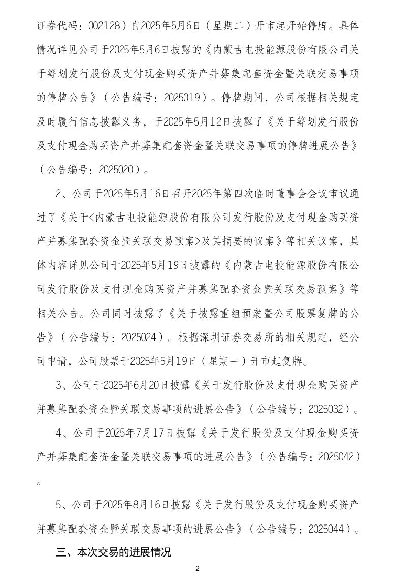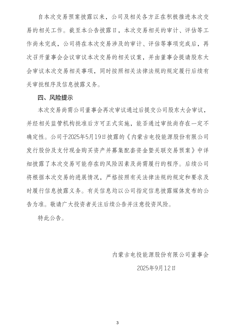 自本次交易預(yù)案披露以來,電投能源及相關(guān)各方正在積極推進本次交易的相關(guān)工作。截至本公告披露日,本次交易相關(guān)的審計、評估等工作尚未完成,電投能源將在本次交易涉及的審計、評估等事項完成后,再次召開董事會會議審議本次交易的相關(guān)議案,并由董事會提請股東大會審議本次交易相關(guān)事項,同時按照相關(guān)法律法規(guī)的規(guī)定履行后續(xù)有關(guān)審批程序及信息披露義務(wù)。