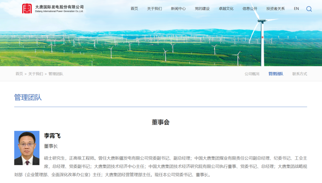 李霄飛,碩士研究生,正高級工程師。曾任大唐新疆發電有限公司黨委副書記、副總經理;中國大唐集團煤業有限責任公司副總經理、紀委書記、工會主席,總經理、黨委副書記;大唐集團技術經濟中心主任;中國大唐集團技術經濟研究院有限公司執行董事、黨委書記、總經理;大唐集團戰略規劃部(企業管理部、全面深化改革辦公室)主任;大唐集團經營管理部主任。現任大唐國際黨委書記、董事長。