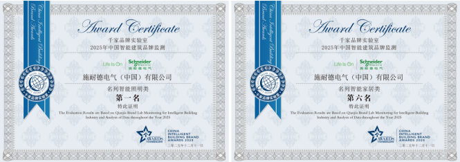 憑借在建筑領(lǐng)域的領(lǐng)先技術(shù)和綜合成果,施耐德電氣獲得了廣泛市場認(rèn)可,在千家品牌實(shí)驗(yàn)室主辦的年度評選中,連續(xù)第六年榮獲“2025年十大智能照明品牌第一名”,并且還斬獲“2025年度十大建筑能源管理第三名”及“2025年樓宇自控領(lǐng)先品牌獎”等多項(xiàng)榮譽(yù)。值得一提的是,施耐德電氣還在今年首次入選了“智能家居品牌第六名”,實(shí)現(xiàn)了全新突破。