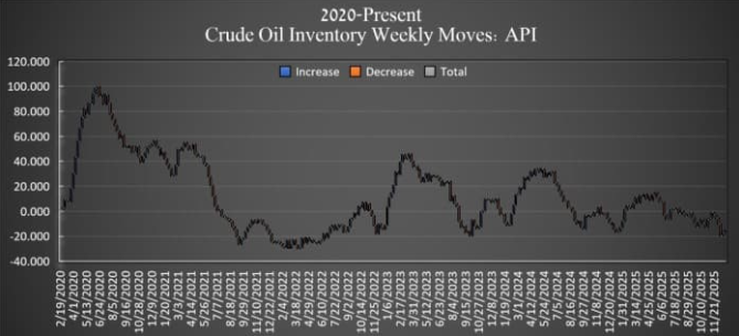 根據(jù)美國(guó)石油協(xié)會(huì)(API)2025年12月30日公布的數(shù)據(jù),截至2025年12月26日當(dāng)周,美國(guó)原油庫存增加了170萬桶,為連續(xù)第二周增長(zhǎng)。此前一周的庫存增幅為240萬桶。今年迄今,美國(guó)原油庫存整體呈現(xiàn)凈減少510萬桶的趨勢(shì)。