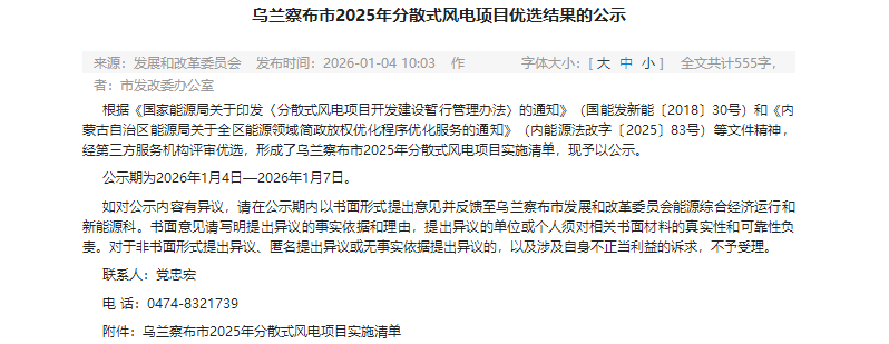 1月4日,內(nèi)蒙古烏蘭察布發(fā)改委公示《烏蘭察布2025年分散式風電項目優(yōu)選結果》。