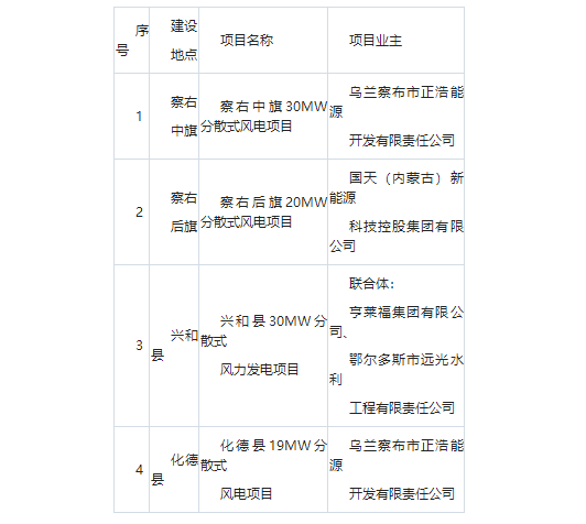 公告顯示,分散式項目共4個,規(guī)模99MW。烏蘭察布市正浩能源開發(fā)有限責任公司獲得49MW;國天(內(nèi)蒙古)新能源科技控股集團有限公司獲得20MW指標;余下30MW指標由亨萊福集團有限公司、鄂爾多斯市遠光水利工程有限責任公司組成的聯(lián)合體獲得。