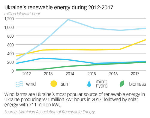 同樣,烏克蘭的可再生能源部門發(fā)展迅速:根據(jù)烏克蘭可再生能源協(xié)會的數(shù)據(jù),從2012年到2017年,可再生能源產(chǎn)量翻了三番。