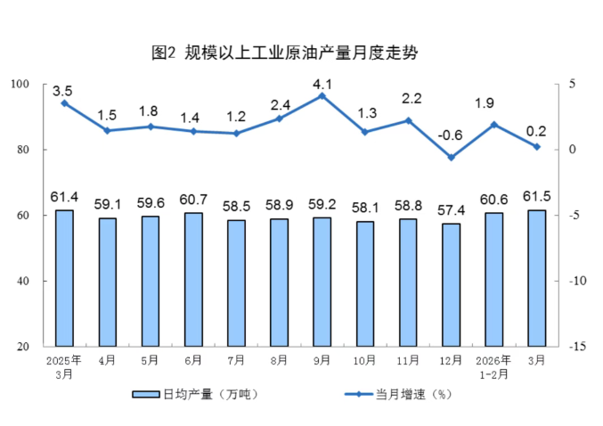 原油生產(chǎn)保持增長。3月份,規(guī)上工業(yè)原油產(chǎn)量1907萬噸,同比增長0.2%;日均產(chǎn)量61.5萬噸。