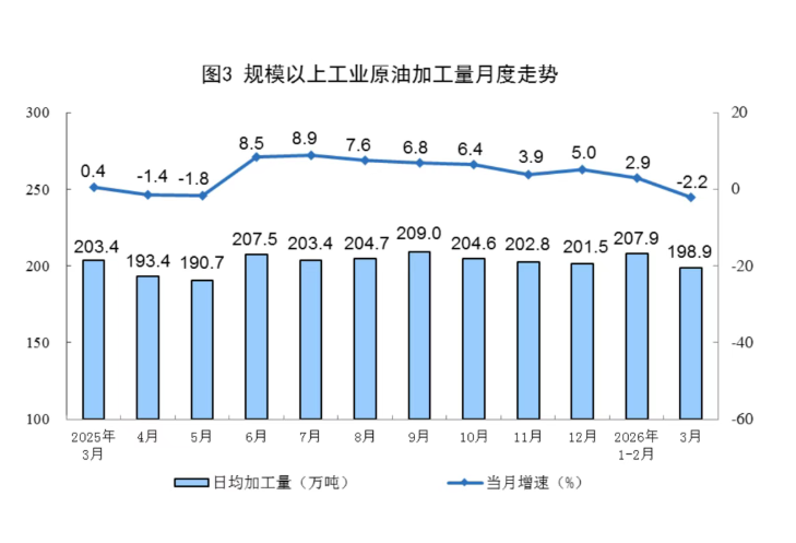 原油加工由增轉(zhuǎn)降。3月份,規(guī)上工業(yè)原油加工量6167萬噸,同比下降2.2%;日均加工198.9萬噸。