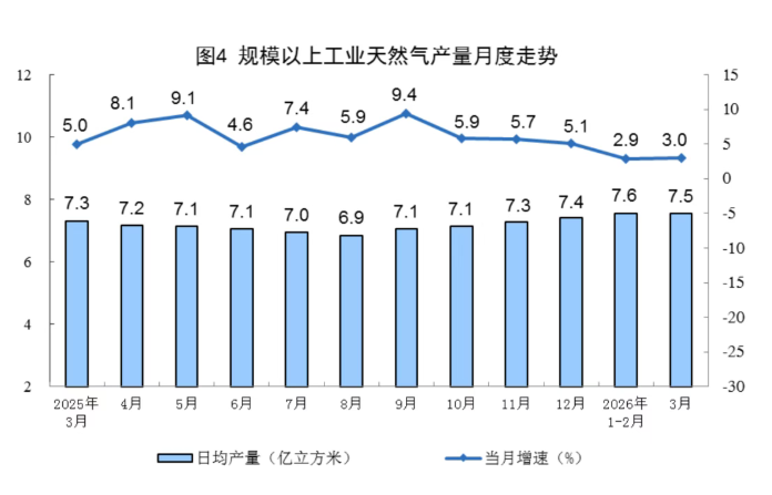 天然氣生產(chǎn)增速加快。3月份,規(guī)上工業(yè)天然氣產(chǎn)量234億立方米,同比增長3.0%,增速比1—2月份加快0.1個百分點;日均產(chǎn)量7.5億立方米。