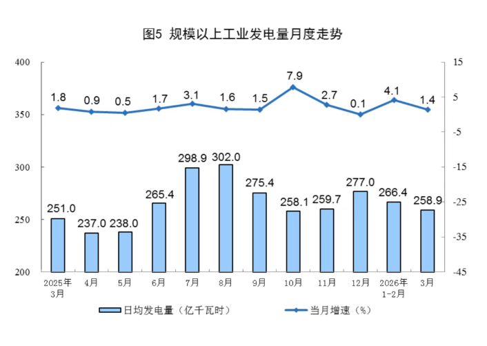規(guī)上工業(yè)電力生產(chǎn)穩(wěn)定增長。3月份,規(guī)上工業(yè)發(fā)電量8025億千瓦時,同比增長1.4%,增速比1—2月份回落2.7個百分點;日均發(fā)電258.9億千瓦時。1—3月份,規(guī)上工業(yè)發(fā)電量23782億千瓦時,同比增長3.4%。