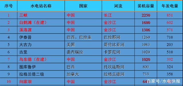 此外還有烏東德電站裝機1020萬千瓦,排在第7;向家壩電站裝機容量640萬千瓦,排在第10。榜單的前三名,均被我國占據,足見我國水電建設的成就和實力,真是厲害了,我的國!