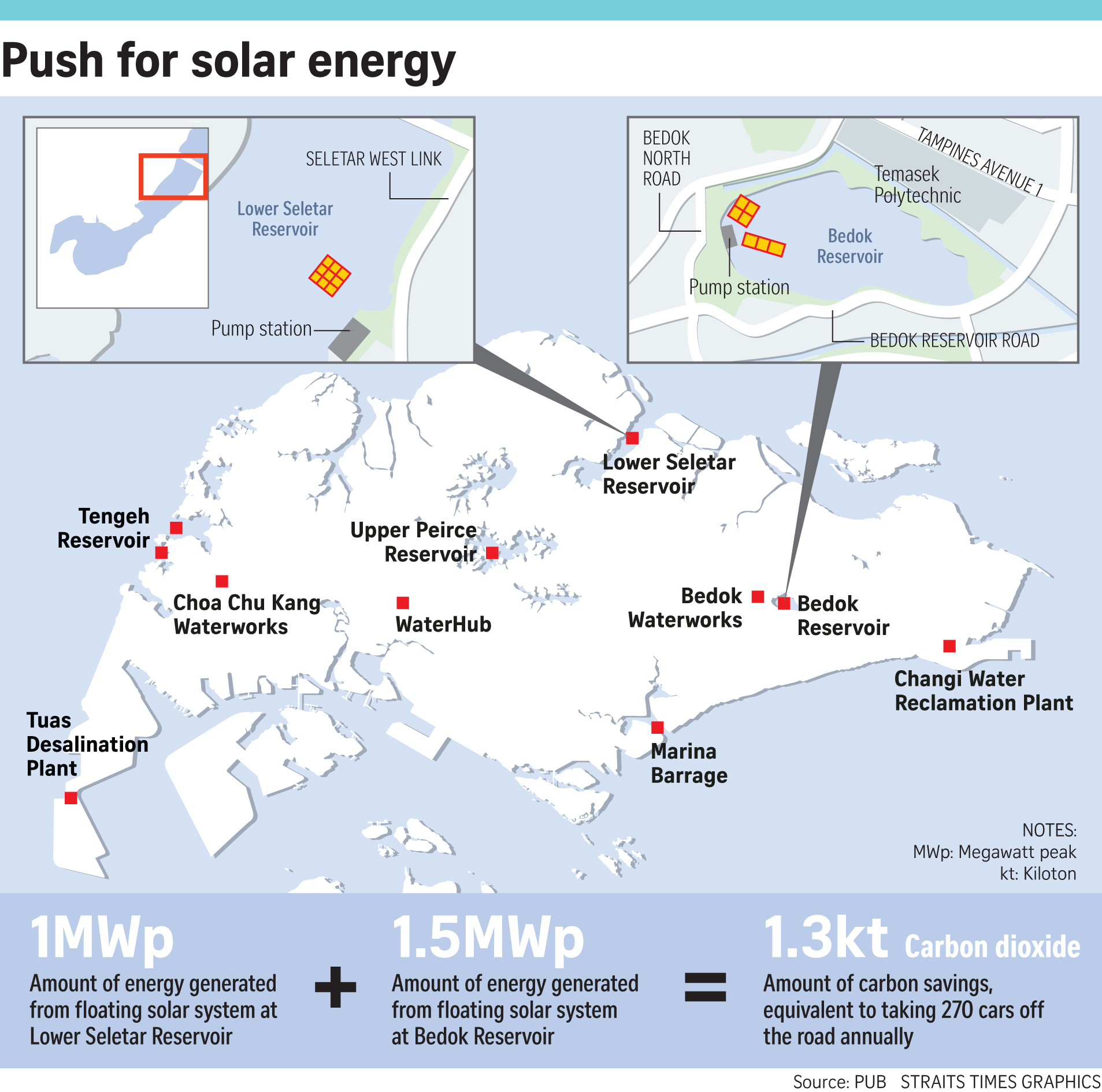 在兩個水庫建立太陽能系統(tǒng)每年將減少PUB的碳足跡,估計每年排放約1.3千噸二氧化碳,相當于每年在道路上行駛大約270輛汽車。